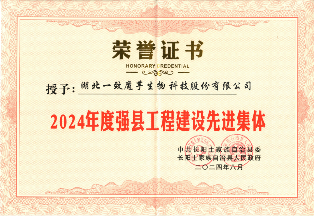 在8月5日上午舉行的長陽縣全縣強縣工程建設及優化營商環境大會上,一致魔芋獲得“長陽縣2024年度強縣工程建設先進集體”榮譽稱號。這一表彰不僅是對企業過去一年在強縣工程建設中辛勤付出與努力的肯定,更是對其在推動縣域經濟發展、促進鄉村振興方面所發揮引領作用的高度認可。?這份榮譽既是鼓勵也是鞭策。作為行業內的佼佼者,一致魔芋始終將自身的發展與縣域經濟的繁榮緊密相連,將助力鄉村振興視為己任。在
